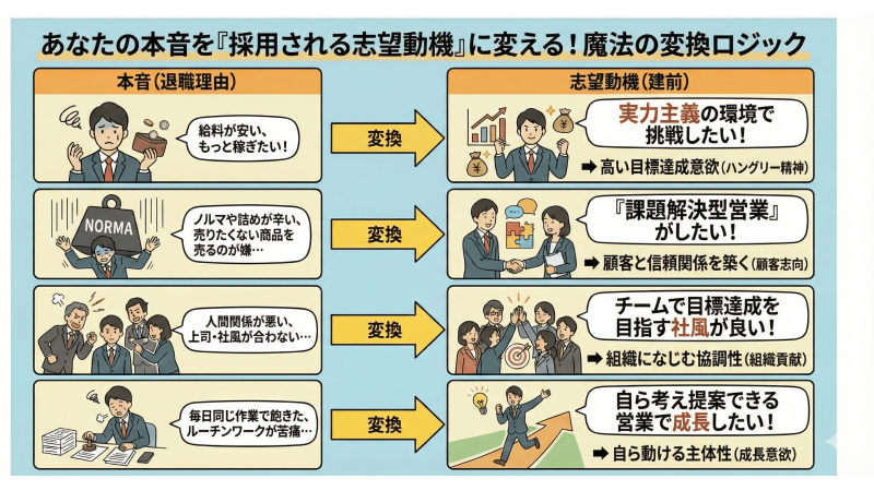 ポイントは、今の会社の不満(過去)をただ嘆くのではなく、「営業職ならその不満を解消し、どう活躍できるか(未来)」に焦点をずらして考えてください。
