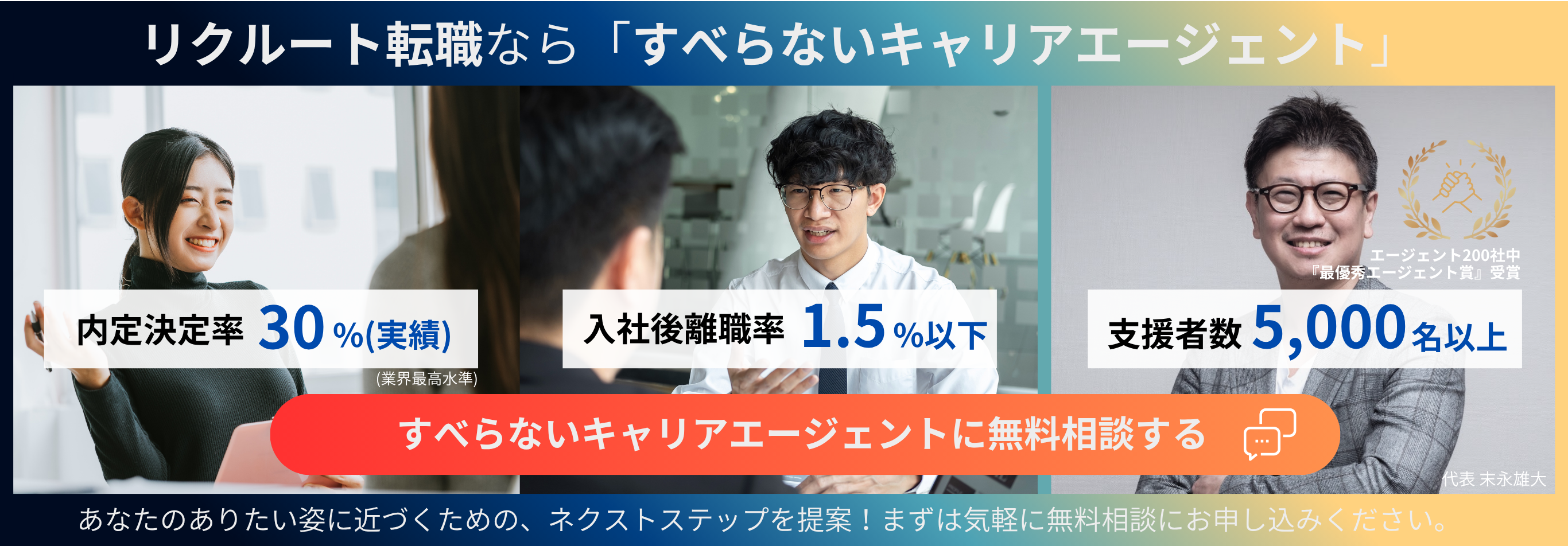 すべらない転職が紹介するサービスの一部には広告を含んでおり、当サイトを経由してサービスへの申込みがあった場合には、各企業から支払いを受け取ることがあります。ただし、ユーザーの利益を第一に考え客観的な視点でサービスを評価しており、当サイト内のランキングや商品の評価に関して影響を及ぼすことはございません。
