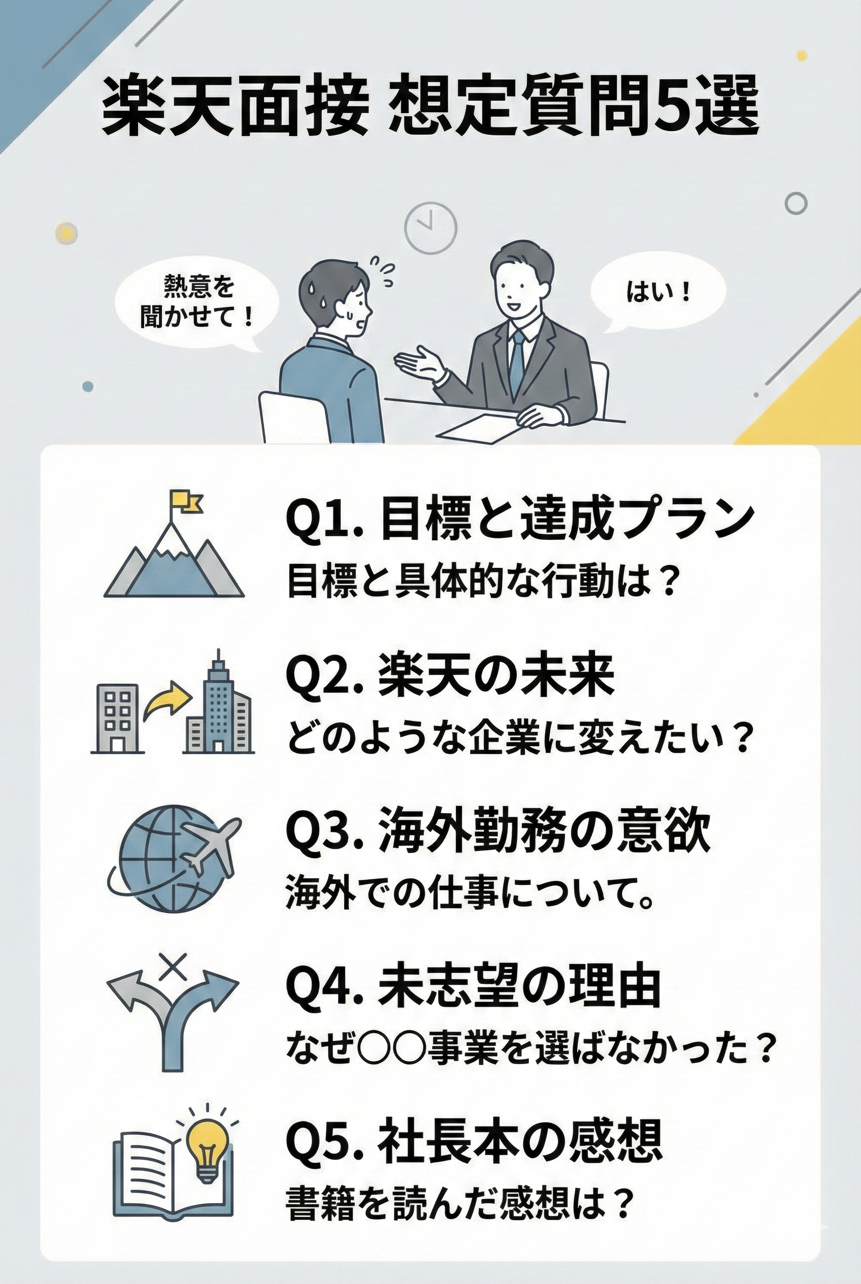 「スピード!!スピード!!スピード!!」や「常に改善、常に前進」など、楽天の行動指針を理解し、自身の経験と結びつけて説明できるようにする