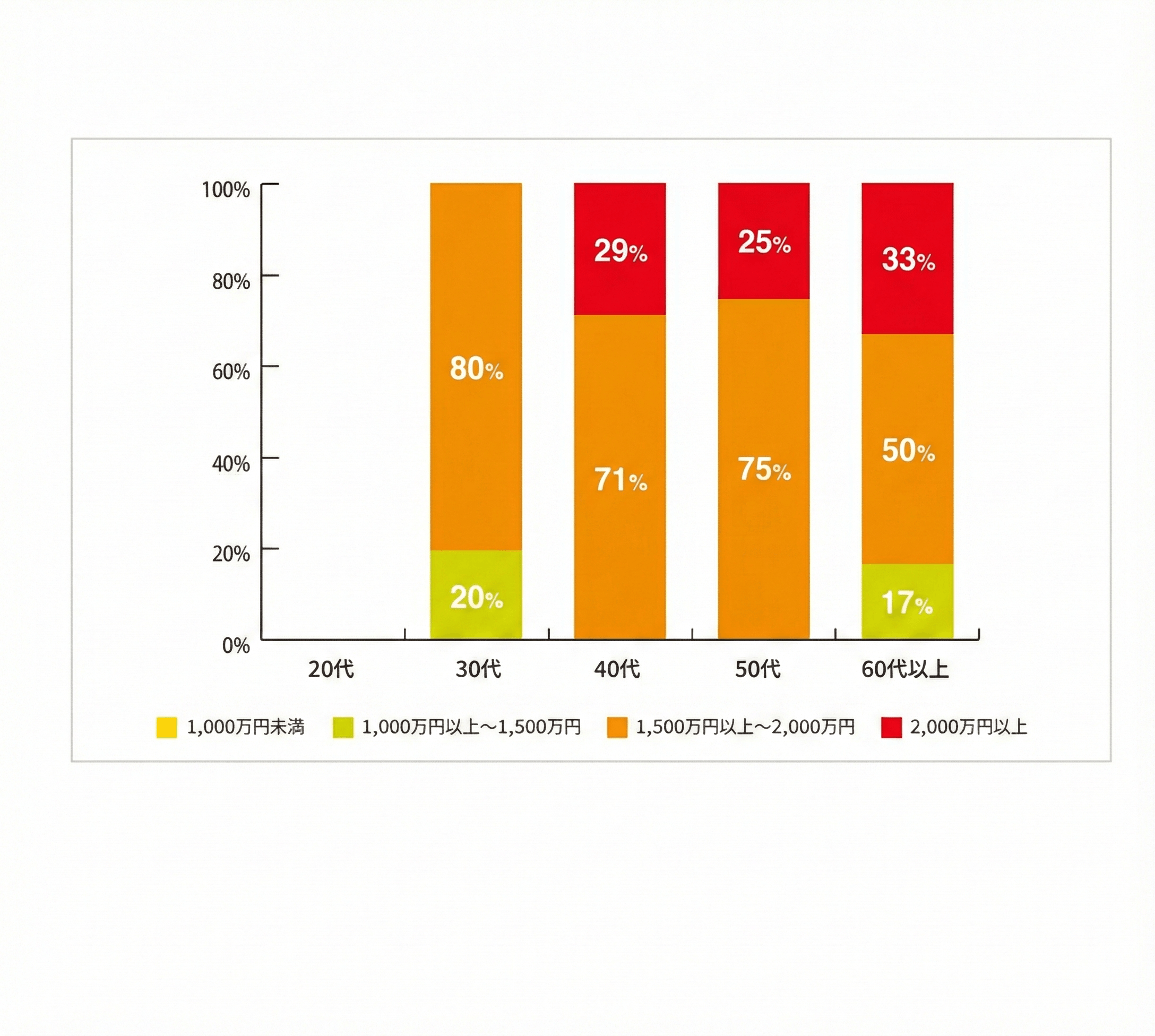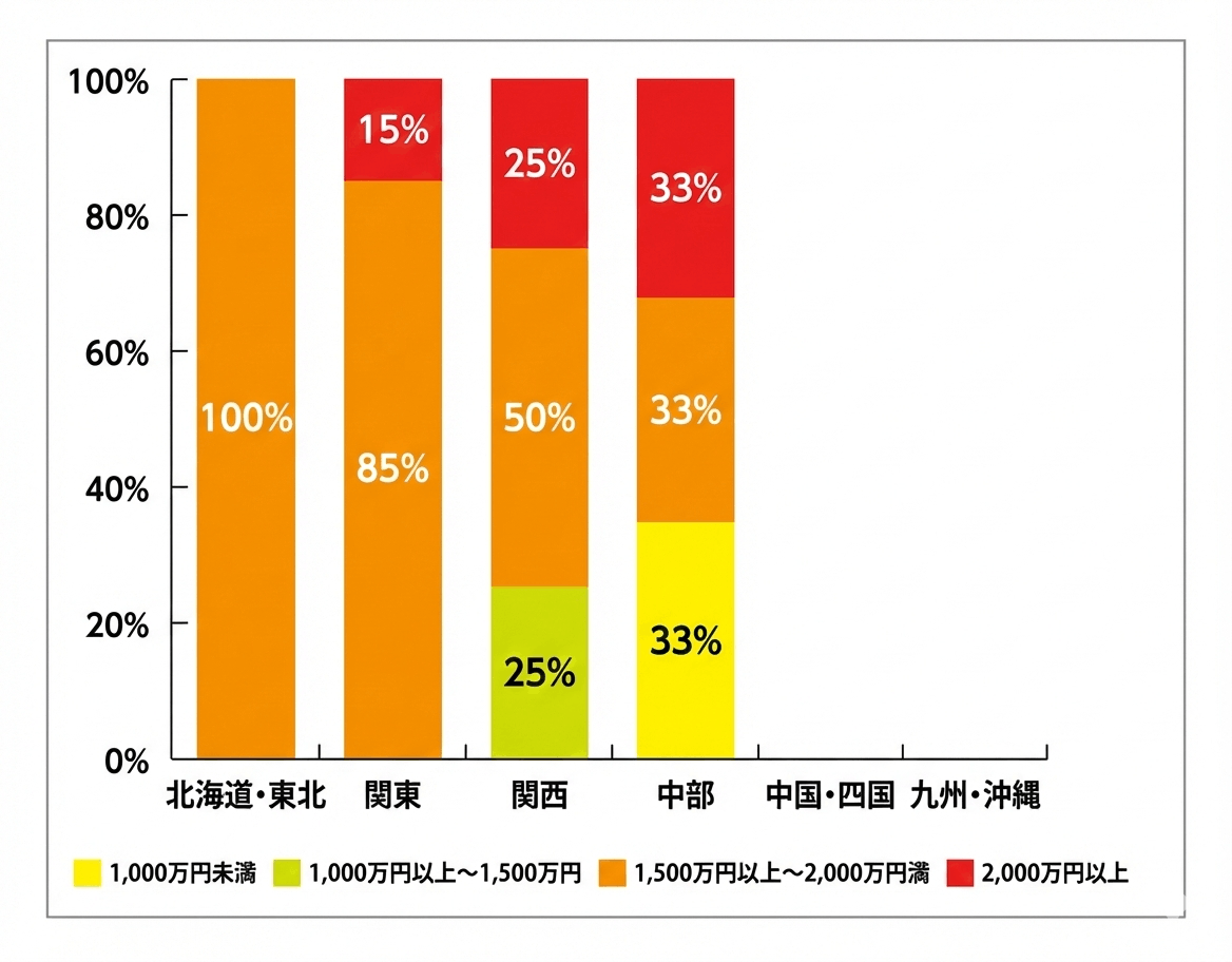 北海道・東北は1500~2000万円が100%、関東も1500万円以上が100%(うち2000万円以上が15%)と安定して高水準です。