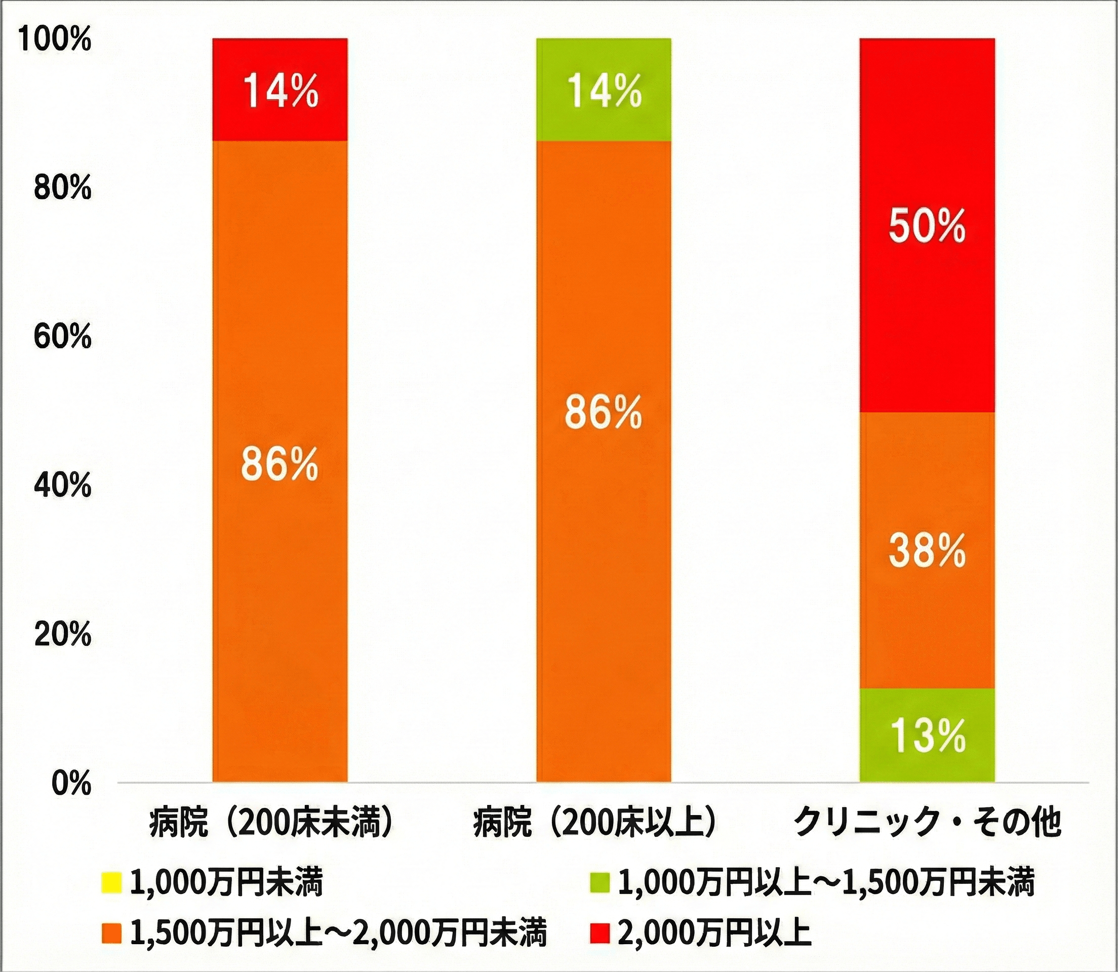 病院(200床未満)は全員が1500万円以上で、2000万円以上も14%います。病院(200床以上)も1500~2000万円が86%ですが、2000万円以上の層はいません。